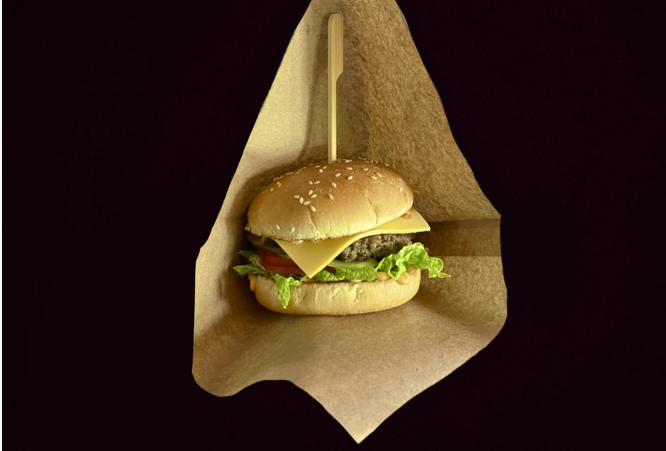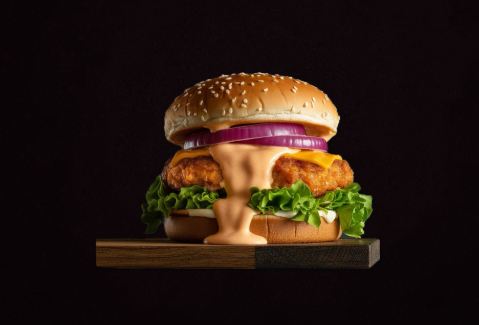 Булочка, фирменный соус, расплавленный сыр чеддер, маринованный огурчик, пекинская капуста, котлета из свинины и говядины обжаренная на гриле до золотистой корочки